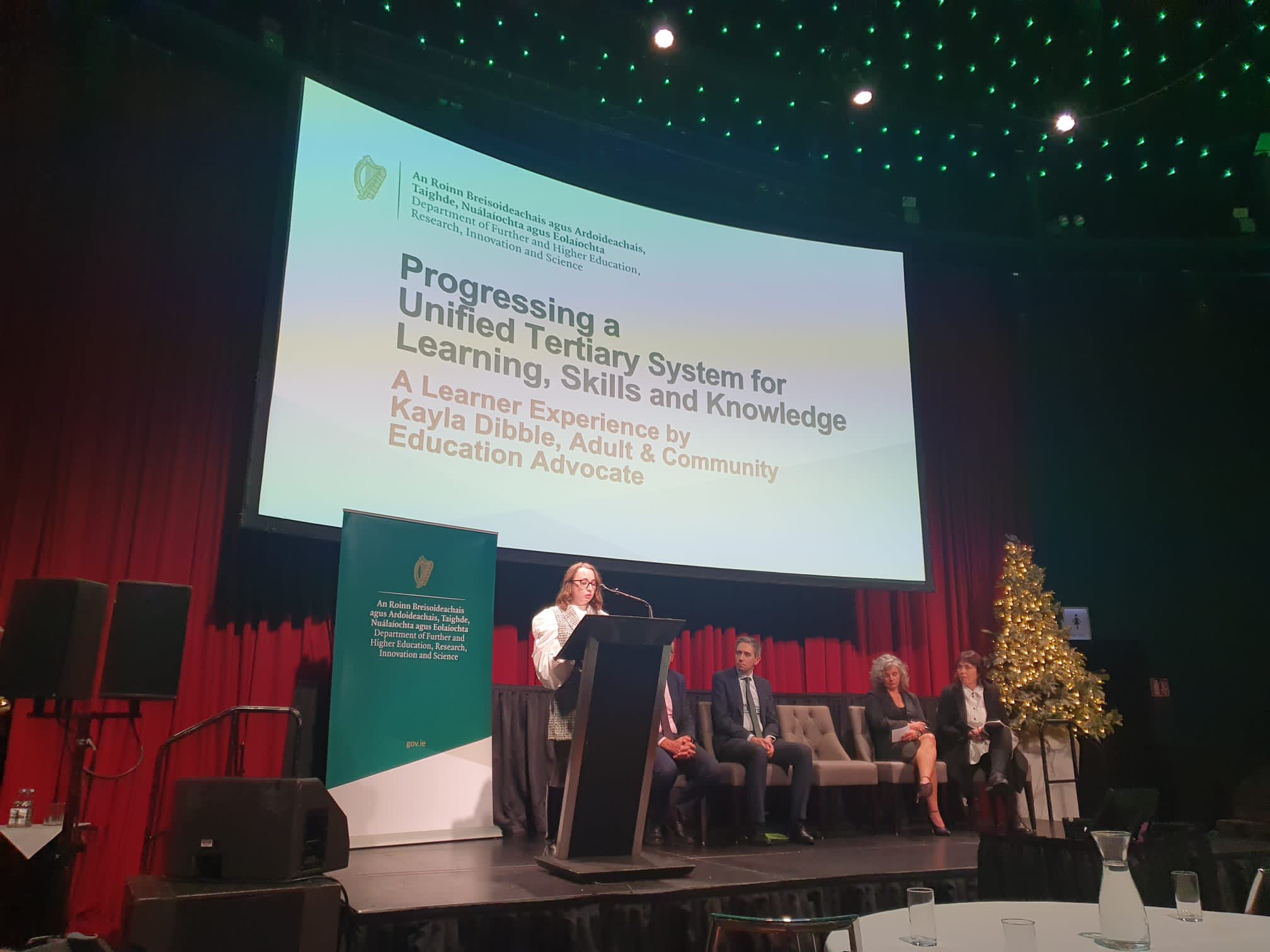 Adult learner advocate Kayla Dibble was the only learner invited to speak at yesterday’s launch, having honed her advocacy and public-speaking skills through AONTAS programmes such as Learners As Leaders. Her contribution was recognised by DFHERIS, as they shared on Twitter that she joined the Minister onstage alongside “Executive Director of Transformation Nessa White and Department colleagues.”